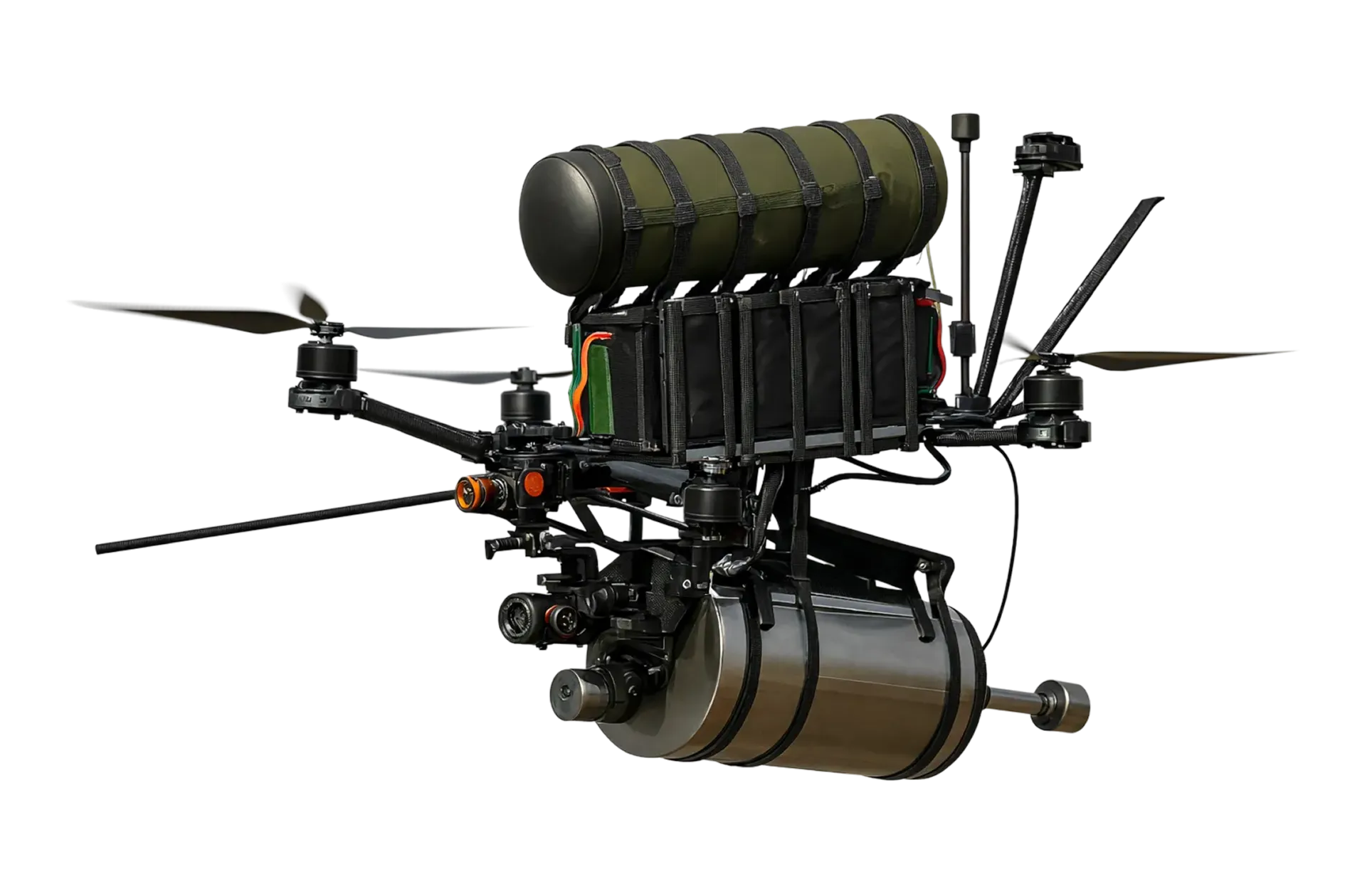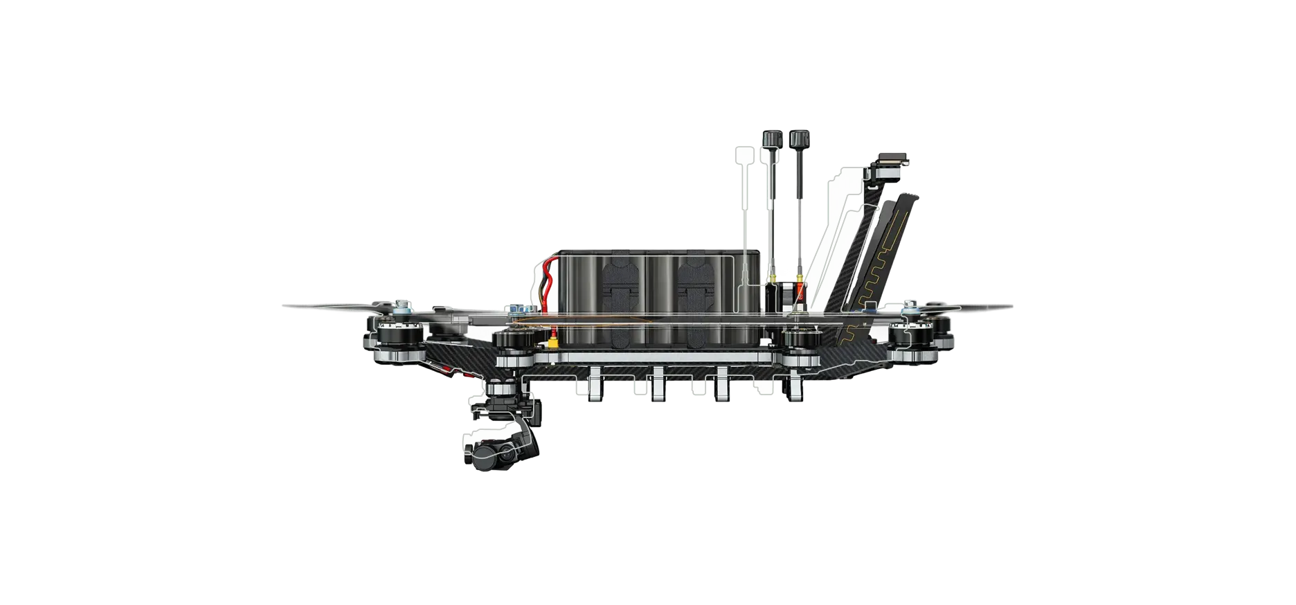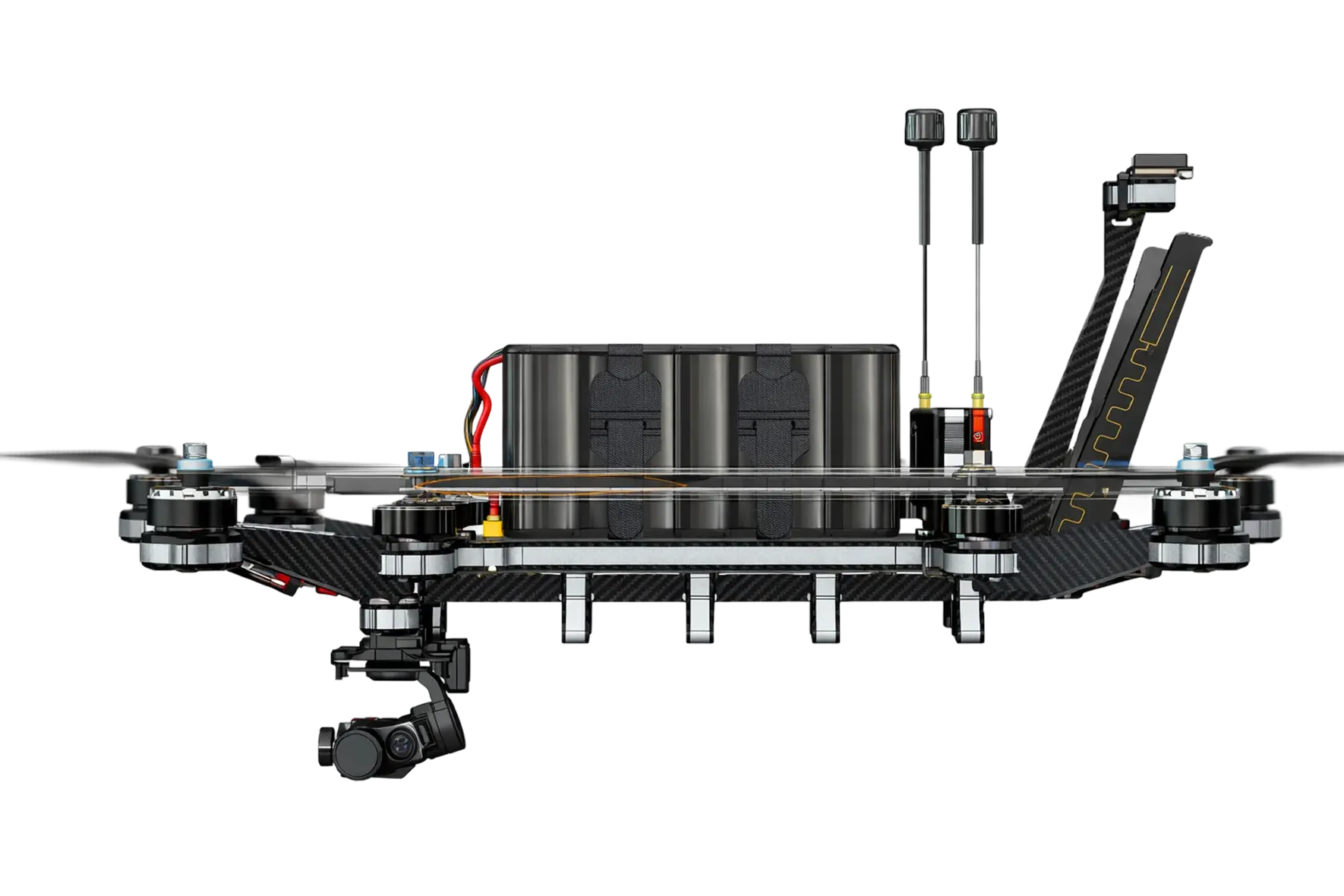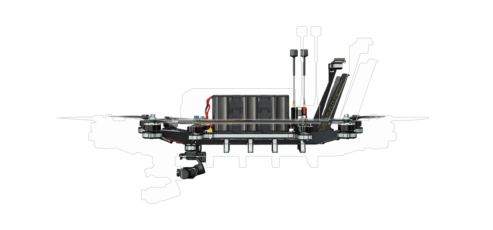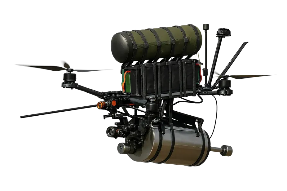 Supports fibre-optic spools, 3-axis gimbal cameras, propeller guards, and additional modules, with more options available as missions evolve.